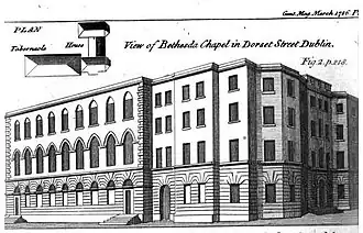 From this time the Chapel took on a more Calvinist tone, and encountered hostility from the Church of Ireland hierarchy.[11] It drew in Trinity College students, and so recruited the evangelical ranks, and the congregation was influential.[12] Arthur Guinness II, an evangelical Christian, was one of them. In 1798 Maturin took the living of Clondavaddog, after the murder there the previous year of the incumbent William Hamilton, and Walker became the sole chaplain.[13][14][15]