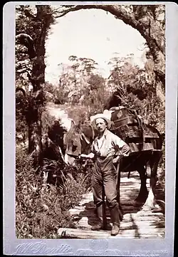 Undertaking extensive photography around Tasmania, as well as in the Central Highlands and on the West Coast of Tasmania, Beattie was employed by the mining company North Mount Lyell to photograph between Gormanston and Kelly Basin in the 1890s. Though Hore[12] notes that Beattie warned that within just a "few years the highlands of Lyell will be bare desolate wastes,"[13] Davidson asserts that he "saw no contradiction in [photographing for] conservation, development and tourism,"[14] and Ennis reports that he "always carried an axe that he used to overcome any faults in his compositions,"[5] and would move grass trees or pandanus in to frame the scene.[15] Haynes, however, considers that his successful lobbying for protection of the Gordon River and surrounds for their tourist value positions him as an environmental activist;[16] he presented on the subject of the preservation of "scenery" to the Royal Society in 1908: