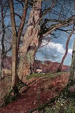 Inchbold became a pupil of Louis Haghe, the water-colour painter, and was a student at the Royal Academy in 1847. He exhibited at the Society of British Artists in 1849, at the Academy from 1851.[2] At first he worked in watercolour in a free style, but his first exhibited oil painting, shown at the Academy in 1852 showed the influence of the Pre-Raphaelite movement,[1] and in 1855 he gained the enthusiastic praise of John Ruskin for The Moorland, which he painted to illustrate a passage from Tennyson's Locksley Hall.