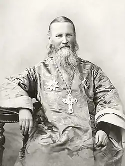 John of Kronstadt or John Iliytch Sergieff[3] (pre-reform Russian: Іоаннъ Кронштадтскій; post-reform Russian: Иоа́нн Кроншта́дтский; 31 October [O.S. 19 October] 1829[a] – 2 January 1909 [O.S. 20 December 1908]) was a Russian Orthodox archpriest and a member of the Most Holy Synod of the Russian Orthodox Church. He was known for his mass confessions, numerous miracles,[4] and charitable work, as well as his monarchistic and anti-communist views.[5][6][7][8][9][10][11][12][13][14]