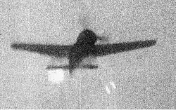 Johnson's wing was the first to be stationed on French soil following the invasion. With their radius of action now far extended compared to the squadrons still in Britain, the wing scored heavily through the summer.[66] On 21 August 1944, Johnson was leading No. 443 Squadron on a patrol over the Seine, near Paris. Johnson bounced a formation of Focke-Wulf Fw 190s, shooting down two, which were recorded on the cine camera.[67] Climbing back to his starting point at 8,000 ft, Johnson attempted to join a formation of six aircraft, he thought were Spitfires. The fighters were actually Messerschmitt Bf 109s. Johnson escaped by doing a series of steep climbs, during which he nearly stalled and blacked out. He eventually evaded the Messerschmitts, which had been trying to flank him on either side, while two more stuck to his tail. Johnson's Spitfire IX was hit by enemy aircraft fire for the only time, taking cannon shells in the rudder and elevators.[68] Johnson had now equalled and surpassed Sailor Malan's record score of 32, shooting down two Fw 190s for his 32nd and 33rd air victories.[69] However Johnson considered Malan's exploits to be better. Johnson points out, when Malan fought (during 1940–41), he did so outnumbered, and had matched the enemy even then. Johnson said: