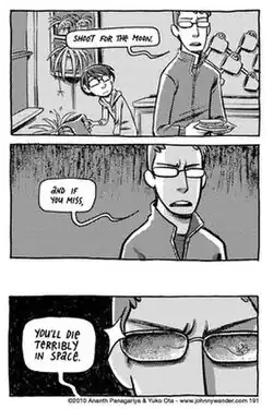 Johnny Wander is a former webcomic written by Ananth Hirsh and illustrated by Yuko Ota. It was published bi-weekly.[1] In its earlier days, the comic generally focused on slice of life stories involving Ananth, Yuko, and their friends and family following graduation from college. However, the comic occasionally encompasses unrelated fantasy storylines. The comic is currently focusing on one of its ongoing fictional storylines, "Barbarous." The name "Johnny Wander" is meant to evoke the creators' desire to use the comic to "wander" through whatever topics interest them at the moment.