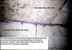 A building joint is a junction where building elements meet without applying a static load from one element to another. When one or more of these vertical or horizontal elements that meet are required by the local building code to have a fire-resistance rating, the resulting opening that makes up the joint must be firestopped in order to restore the required compartmentalisation.