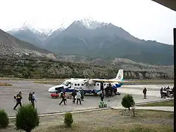 Jomsom Airport (Nepali: जोमसोम विमानस्थल, IATA: JMO, ICAO: VNJS) is a domestic airport located in Jomsom serving Mustang District, a district in Gandaki Province in Nepal.[1] It serves as the gateway to Mustang District that includes Jomsom, Kagbeni, Tangbe, and Lo Manthang, and Muktinath temple, which is a popular pilgrimage for Nepalis and Indian pilgrims.[4]