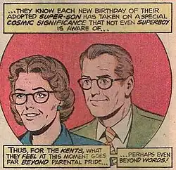 Jonathan Kent and Martha Kent (often referred to as "Pa" and "Ma" Kent, respectively) are fictional characters in American comic books published by DC Comics. They are the adoptive parents of Superman, and live in the rural town of Smallville, Kansas.[1] In most versions of Superman's origin story, Jonathan and Martha find Kal-El as an infant after he crash-lands on Earth following the destruction of his home planet, Krypton. They adopt him shortly thereafter, renaming him Clark Kent, "Clark" being Martha's maiden name.
