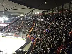 Being located on the site of an old brickyard, the architecture took advantage of the hillside and dug the venue deep into the hill. This also resulted in the venue having a highly asymmetric shape, with tall spectator stands on the one side and nearly none on the other.[7] The arena had a capacity for 4,450 spectators, of which 3,078 could be seated. It also featured nine luxury suites.[18] The asymmetrical shape and retrofitted roof gave the arena several undesirable traits. The construction of the roof contributed to poor ice quality. During its final years, it was also considered severely outdated. The stands were known to be steep, diminishing accessibility, complicating logistics and hampering even able-bodied spectators.[19]