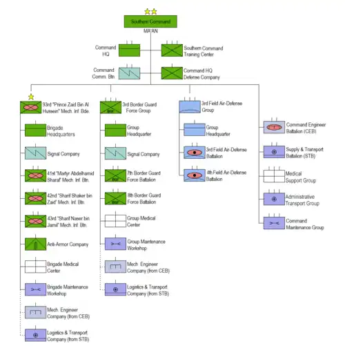 Jordanian Southern Command is the smallest regional command in JAF, this command defend 4 cities and consist of one Armoured brigade, one infantry brigade and other support units.[1] In 2000 the King Abdullah II made a big step to modernize and restructure Jordanian Armed Forces when the Divisions have been transformed into a lighter, more mobile forces, based largely on a brigade structure and considered better capable of rapid reaction in emergencies.[2][3]