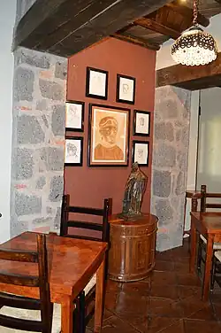 The Museum's collection includes more than 1860 pieces by various artists, mostly from Latin America. The pieces are rotated among the various building's rooms. One of the main pieces is "La Giganta" ("The Giantess") by Cuevas, which is situated in the central courtyard.[23] The androgynous sculpture was created in 1991 and inspired by a poem by Baudelaire.[2][8] The museum is considered to be controversial in no small part due to the “Erotic Room," filled with Cuevas' own drawings on the theme and of actual bordellos and cabarets, and the presence of a large brass bed on which he claimed he had many sexual encounters.[8][17] The museum also contains a library with 45 large volumes with over 11,500 newspaper clippings as well as 500 books dedicated to Cuevas' work.[4]