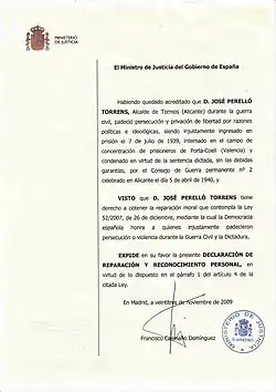 In November 2009 his great-grandson managed, in the framework of the law of historical memory of Spain (2007), a statement of moral reparation and personal recognition by the Ministry of Justice, awarded to those who unjustly suffered persecution or violence during the Civil war and Franco's dictatorship. They have also received the same recognition, among others, Miguel Hernández and Lluís Companys. In November 2011 the Tormos city council decided to give the name "Alcalde José Perelló Torrens" to a new street as an act of recognition to the labour of José Perelló Torrens.