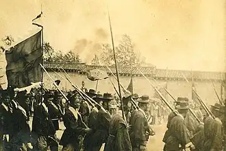The Joseon Army, as it existed in the early 1890s, consisted of about 3,000–50,000 soldiers at the time of the Donghak Peasant Revolution.[7] In January 1894, the modernized army was deployed against the Donghak Peasant Revolution but lost many battles in the beginning due to their sheer numbers and innovative tactics. When Gojong requested help from the Qing to suppress the rebels, the Japanese sent troops to Seoul, demanding the Joseon Government send the Qing back. The government refused, and Japan stormed Gyeongbokgung. Despite resistance from Capital Guards Command, Japan occupied the palace and established a pro-Japanese government beginning the Gabo Reform and the Sino-Japanese War.[8] As per the Gabo Reform, the government disbanded the Capital Guards Garrison. Japan allied with the Joseon Army and finally suppressed the Donghak rebels in December 1895. The Japanese forced the Qing out of Joseon after winning the war.