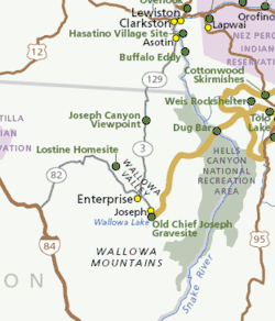 The Joseph Canyon Viewpoint, at a highway pullout along Oregon Route 3, is one of 38 sites that form the Nez Perce National Historical Park. The viewpoint is located approximately 30 miles (48 km) north of Enterprise, Oregon, and 11 miles (18 km) south of the Washington border, in the Wallowa–Whitman National Forest.[5]