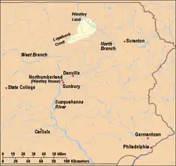 Priestley's son, Joseph Priestley Jr., was a leading member of a consortium that purchased 300,000 acres (1,200 km2) of land along Loyalsock Creek (between the North and West Branches of the Susquehanna River).[32] Shortly thereafter, Thomas Cooper, a friend of Joseph Priestley's, published a pamphlet in Britain titled Some Information Respecting America, meant to encourage others to settle in Pennsylvania and offering instructions on how to do so. It detailed a clear plan for establishing and financing a settlement. The French translation, Renseignemens sur l'Amérique,[33] was, according to one scholar, "carefully phrased in legal terminology" and "lucidly outline[d] an ambitious financial venture".[34] However, it is unclear whether Cooper's scheme was related to the lands that the younger Priestleys had purchased.