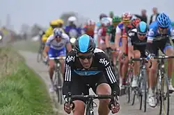 In 2010, he joined Team Sky. At the beginning of the season, he participated in his squad's victory at the Team time trial of the Tour of Qatar.[19] He got his first major one-day race victory with his new team in the Omloop Het Nieuwsblad, becoming the first Spanish rider to win the event. He counter-attacked Philippe Gilbert on a cobbled section before making a 20 kilometres (12 mi) solo effort for the finish. He dedicated the win to his team and to his former teammate Frank Vandenbroucke who died in October 2009.[20] In March he took the third step of the podium in the E3 Prijs Vlaanderen behind eternal classic rivals Tom Boonen and Fabian Cancellara. The three of them had broken clear with more than 25 kilometres (16 mi) to cover and cooperated to keep the chasers at bay, until Cancellara launched an attack with 2 kilometers remaining and won the race with a sizable gap. Flecha was out sprinted by Boonen for the second place.[21] Two weeks later at Paris–Roubaix, he took another third place after breaking away from the chasers with Thor Hushovd in a vain attempt to reach Cancellara. The latter escaped shortly before the cobbled sector Mons-en-Pévèle and would be untouchable on that day, while Hushovd's sprinting speed proved too much for Flecha.[22] Tom Boonen was upset that Flecha and the chasing group didn't bring back Cancellara in a concerted effort and made comments to that effect, but he didn't follow Flecha and Hushovd when they attacked.[23]