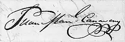 Juan Manuel Canaveris also used the variant Canavery of his surname, permanently modifying it from 1835 when he began to sign as Canaveris. He died at the age of 64 on May 2, 1868, being witnesses Emilio Achinelly and Tomás Quincke.[46] Possibly he was a descendant of Irish Catholic families emigrated to France and Northern Italy in the early or mid 17th century. His descendants were linked to families of Enrique Yateman, Juan José Viamonte and José Fornaguera.