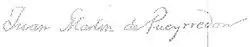 Pueyrredón was born in Buenos Aires, the fifth of eight sons of Juan Martín de Pueyrredón y Labroucherie, and his wife, María Rita Damasia O'Doggan y Soria. Pueyrredon's father was a French merchant who established himself in Cádiz with his brother, and later in Buenos Aires, where he married his wife, who was of Spanish and partial Irish descent.[1] He was educated at the Royal College until the death of his father in 1791. María became the head of the family, assisted by Anselmo Sáenz Valiente in business, and withdrew Juan Martín from his studies at the age of 14.[2] He then moved to live with a relative in Cádiz, Spain to learn about commerce. His first business took him to Madrid and France. He returned briefly to Buenos Aires to deal with his father's will, and married his cousin Dolores Pueyrredón, daughter of Diego de Pueyrredón y Labrucherie and Maman Mairoluo, in Spain in 1803.[3] They returned to Buenos Aires, but Dolores miscarried during the trip. Pueyrredón thought of returning to Spain with her, hoping to restore her health by visiting her family, but she miscarried again and her health worsened, until she died in May 1805.[4]