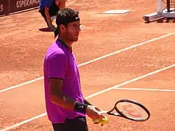 In the clay-court season, del Potro was eliminated in the second round of the Monte Carlo Masters by Ivan Ljubičić.[98] In Rome, del Potro beat Victor Troicki and Wawrinka to advance to the quarterfinals, where he was defeated by defending champion Djokovic in straight sets. This meant del Potro's head-to-head record with the Serb was now 0–3.[96][99] At the Madrid Masters, Del Potro beat Murray for the first time in the quarterfinals,[100] but lost to Federer in the semifinals.[96] At the French Open, where he was fifth seed, del Potro defeated Michaël Llodra, Troicki, Andreev, and ninth seed Tsonga en route to the quarterfinals.[101] He then defeated three-time former quarterfinalist Tommy Robredo to get to his first semifinal of a Grand Slam.[102] He was defeated in a close semifinal, where he was leading by a set twice, by eventual champion Federer who, after their match, said: "[Del Potro] is young and strong, I have a lot of respect for him."[103][104] Prior to this encounter, del Potro had never taken a set from Federer in their five previous career meetings.[105]