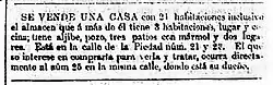 The houses of the Canaveris Esparza family, which also had a warehouse and stables, were rented to English, French and Irish immigrants established in Buenos Aires since the end of the colonial period. It was also inhabited in his adulthood by his sons Joaquín and Juan José Canaveris,[78] and then acquired at public auction by his grandson Juan Manuel Canaveris, who lived in it until his death in 1868.[79] The houses of Nos. 21 and 23 were sold by Juan Manuel Canaveris to Nicolás Hugo de Anchorena (husband Mercedes Castellanos de Anchorena) in 1857. These properties had a land of seventeen and a half yards in front and seventy yards of surface in the background.[80]