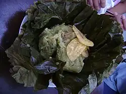 The juane is one of the main dishes of the cuisine of the Peruvian jungle and is widely consumed on June 24, the feast of St. John the Baptist (San Juan), hence the name.[1] It is known that after the arrival of the Spanish people to Incan lands, missionaries popularized the biblical account of the beheading of St. John. This dish's name could therefore be, more specifically, a reference to the head of St. John.[2] It possibly originated in the city of Moyobamba.[3][4]