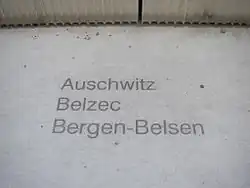 Engraved on the plinth on the two sides and back of the memorial are the names of those places where Austrian Jews were murdered during Nazi rule: Auschwitz, Bełżec, Bergen-Belsen, Brčko, Buchenwald, Chełmno, Dachau, Flossenbürg, Groß-Rosen, Gurs, Hartheim, Izbica, Jasenovac, Jungfernhof, Kaiserwald, Kielce, Kowno, Łagów, Litzmannstadt, Lublin, Majdanek, Maly Trostinec, Mauthausen, Minsk, Mittelbau/Dora, Modliborzyce, Natzweiler, Neuengamme, Nisko, Opatów, Opole, Ravensbrück, Rejowiec, Riga, Šabac, Sachsenhausen, Salaspils, San Sabba, Sobibor, Stutthof, Theresienstadt, Trawniki, Treblinka, Włodawa, and Zamość.[12]