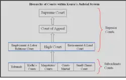 The Judiciary of Kenya consists of three Superior courts; the Supreme Court, Court of Appeal, High Court. The Employment & Labor Relations Court, the Environment & Land Court are considered to have the same status as the High Court. The subordinate courts consist of the Magistrates Courts, Courts Martial, Small Claims Courts, Kadhi Courts, Tribunals and the Courts Martial.[1]