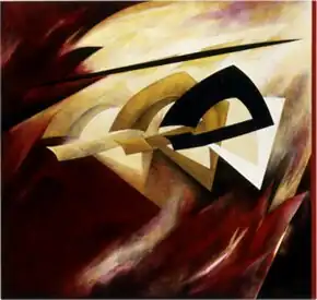 The work Murray exhibited at the Dallas Museum of Fine Arts employed tapering arcs, dynamic lines, and splinter- and scimitar-like forms in more complex, energized compositions that recall Russian constructivism (e.g., Red Wing, 1980; Smoke, 1979–82).[7][14][30] The Dallas Times Herald noted the "sheer visual dazzle" of their varied matte, gloss and slightly textured surfaces and "rhythms answered by counter-rhythms" that were anchored by thin, right-edge tan bars.[14] In the mid-1980s, Murray began experimenting with raised areas of thick pigment, layered underpainting and dappled, gently modeled figures and grounds in paintings that the New York Times noted for contrasts of mysterious light and blackness and dynamic versus subdued, gradually clarified forms (e.g., Mercury or Bishop, 1983–4).[5][35][36] Los Angeles Times critic Kristine McKenna described them as "anthropomorphic abstractions" built around "Jungian shapes freighted with inexplicable meaning" that coursed with energy and suggestions of the struggle toward consciousness.[24]