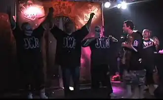 At Bloodymania III, the Juggalo World Order (Corporal Robinson, Scott Hall, Kevin Nash, Shaggy 2 Dope, and Violent J) was scheduled to face "Holy" Trent Acid and the Alter Boys (Tim, Tom, Terry, and Todd) in the main event.[8] However, Kevin Nash legitimately no-showed the event.[9] After Hall explained to the crowd that he and Nash had split, Sid Vicious was introduced as his replacement and as the newest member of the jWo.[9] During the end of their match, Diamond Dallas Page ran into the ring wearing a jWo jersey and hit Acid with the Diamond Cutter, allowing Violent J to get the pin.