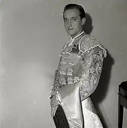 Aparicio's confirmation took place at Las Ventas in Madrid on 19 May 1951. Standing as "godfather" this time was Manuel González Cabello, while "El Litri" once again stood as witness, and the bull used for the ceremony was Cachifo, from the Moreno Urquijo ranch.[3] He got great ovations for the bulls that he fought.[1] He fought bulls 44 times at Las Ventas,[4] and was borne shoulder-high out through the Great Gate seven times, in 1951, 1953, 1954 (twice), 1955, 1957, and 1962.[1] On 1 October 1961, he fought bulls with great success before a crowd of 60,000 in Beirut, Lebanon, alternating with Juan Bienvenida and Juan García "Mondeño". The bulls were laid on by the Hidalgo Rincón y de Quesada ranch.[5] In 1964, he was awarded the Cross of the Order of Beneficence for the great number of charitable bullfights in which he had participated.[6][7]
