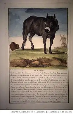 A jumart or jumar[1] is a alleged hybrid between cattle (Bos taurus) and a species of equine (horse or donkey). Jumarts were once widely believed by Europeans to actually exist, and many people claimed to own or have encountered the animals. While they were discussed extensively in early scientific writings, such hybridization is now believed to be biologically impossible, and many "jumarts" examined by later researchers were alleged to be hinnies (a hybrid of a male horse and female donkey) instead.[1] The term is of French origin and most historical writings about supposed jumarts were in the French language.[2] Extensive information about jumarts is available here: here