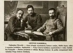 Aukštuolaitis issued various orders, particularly on martial law and mobilization, without approval or consultation of the Lithuanian government.[18] Aukštuolaitis also planned various military actions without authorization. In particular, he conspired with Vincas Grigaliūnas-Glovackis, commander of the 2nd Infantry Regiment, to join their forces with the Latvians and take control of Samogitia.[19] Both Aukštuolaitis and Glovackis were arrested on 7 March 1919.[20] However, within a few days, the government of Prime Minister Mykolas Sleževičius resigned and minister Velykis was replaced by Antanas Merkys. The investigation was dropped and Aukštuolaitis was released.[21] The battalion was officially disbanded on 25 March 1919.[22]