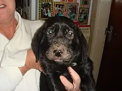 Juvenile cellulitis, also known as puppy strangles or juvenile pyoderma, is an uncommon disease of dogs.[1] Symptoms include dermatitis, lethargy, depression and lameness. When puppies are first presented with what appears to be staphylococcal pyoderma, juvenile cellulitis, a relatively rare condition, may not be considered.[2]