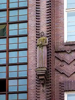 The 6-storey steel-framed office building in purplish brick on the south side of the park at Rungestraße 3–6 and 7, opposite the Bärenzwinger, was designed by Albert Gottheiner (his last work before he was forced to leave Berlin)[48] and built in 1931–32 as the headquarters of the Berlin affiliate of the Allgemeine Ortskrankenkasse (AOK) insurance group.[2][49] The façade is "an outstanding example of late Expressionist architecture",[50] featuring decorative brickwork and pillars, of which the six on the flanking staircase sections are emphasised by terracotta statues.[50] Under the German Democratic Republic, the building housed the Party Academy of the governing Socialist Unity Party from 1955 onwards; a modern extension was built in the mid-1970s, designed by an architectural team led by Friedrich Kalusche.[51][52][53] During this period, the building was renamed the Haus am Köllnischen Park.[54] In summer 1990, after German reunification, the institution closed[51] and the building reverted to the possession of the AOK. As of 2007, it houses their legal division.[55] It is a registered city landmark.[50]