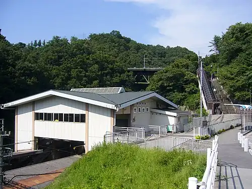 The station consists of two opposed side platforms connected by an elevated station building. The station is located in a valley, and there are escalators to ground-level. The station is unattended.