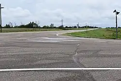 As K-156 enters the county it enters the city of Pawnee Rock.[19] It continues northeast and soon passes Dundee. As it exits Dundee it passes to the south of Great Bend Municipal Airport. K-156 and US-56 then curve north and enter Great Bend as South Patton Road. The highways turn east at 10th Street then soon intersects and begins to overlap with K-96. The three roads continue east along 10th Street for 1.8 miles (2.9 km) to an intersection with US-281 (Main Street), crossing a Kansas and Oklahoma Railroad track along the way. After the three highways cross US-281, they leave Great Bend and 2.2 miles (3.5 km) later, K-156 splits from US-56 and K-96, heading northeast from there.[20] K-156 passes to the east of Cheyenne Bottoms Reservoir, crosses a Kansas and Oklahoma Railroad, then intersects K-4 at a folded diamond interchange east of Claflin. After an interchange with K-4, the highway enters Ellsworth County two miles (3.2 km) later.[21] The highway enters the county and continues northeast before entering Holyrood.[22] As it exits the city, it continues through rural farm lands transitioning into grasslands, and soon intersects K-14 south of Ellsworth. At that junction, K-156 begins carrying a concurrency with K-14 Truck route. The two routes then cross the Smoky Hill River and a Union Pacific Railroad track then enter Ellsworth. Inside the city the two highways curve north at an intersection with 8th Street. The highway passes Memorial Cemetery and soon intersects K-140, known as East 15th Street westbound and Avenue J eastbound. Here, K-14 Truck splits from K-156 and follows K-140 westbound, and K-156 continues north. The highway soon exits the city and continues north for about .8 miles (1.3 km) then curves northeast and crosses Oak Creek.[23] K-156 then reaches a junction with K-111, crossing Spring Creek and East Spring Creek along the way. Past K-111, the landscape around the highway begins to transition to rolling hills covered by grasslands. K-156 then crosses and begins to parallel East Elkhorn Creek. It continues north along the creek for a few miles before reaching its northern terminus at exit 225 of I-70 and US-40 at a diamond interchange.[15][24]