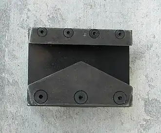 The K-tool, also known as a "K-spreader" or a "K-tool spreader," is a specialized forcible entry tool used by firefighters to gain access to buildings or other structures in emergency situations. It is named for its distinctive "K" shape, which allows it to be used for a variety of purposes.[1] It is used in conjunction with a Halligan bar and a flat-headed axe or maul (commonly referred to as "irons" or (with a maul instead of an axe) "heavy irons" [2]) to remove a cylinder lock with a protruding cylinder. It consists of a steel block roughly 3 inches by 3 inches by 1 inch thick with a K-shaped notch on one side, having sharp edges that grip the end of the cylinder, and a socket to fit the adze of the halligan bar on the other side. The notch is slipped over the lock cylinder, then forced down by striking with the flat side of the axe or maul. The cylinder is forced into the angle of the notch, between the "leg" and "back" of the K. The hard steel bites into the softer metal and provides the needed purchase. The halligan is then inserted into the socket and used to pry the K-tool off the door, thereby pulling the entire key cylinder out. The bolt is then retracted by reaching into the empty cylinder hole with a turning tool, such as a screwdriver.