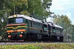 At least three of the ex-Russian locomotives that have entered service, 862, 863 and 870, are of the DM62 type.[12] The DM62 was a variant of that, originally delivered to the Soviet Army between 1982 and 1994. These were operated by the 10th, 52nd and 36th Guards Missile Divisions of the Soviet Army to pull the combat missile trains in which RT-23UTTKh rail-mobile ICBMs were carried.[13] The DM62 differs from the standard M62S by a number of changes designed to improve the reliability and survivability of the locomotive; some of these changes were later incorporated into the design of the (2)M62U. External spotting differences include the bogies, the rectangular housings for the headlights, and the box between the headlight on which the number plates are mounted. Other differences include heat sensors in the journal boxes, automatic starters for the engine, blackout shields, and multiple-unit operation regardless of the locomotives position in the train.[14] Following the dissolution of the Railway Rocket Troops in 2000, these locomotives were transferred to the Russian Railways.