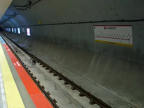 Kadıköy is the western terminal station on the M4 line of the Istanbul Metro.[1] Located beneath Haydarpaşa Rıhtım Caddesi (Street) it is serviced by the M4 between 6:00 and 0:04.[2] The station has two tracks serving an island platform. Kadıköy opened on 17 August 2012 along with fifteen other stations on the M4 line. The Turkish Prime Minister Recep Tayyip Erdoğan along with the Mayor of Istanbul, Kadir Topbaş and other members of government inaugurated the line from Kadıköy and boarded a train to Kartal.