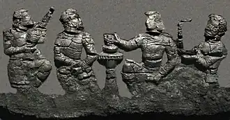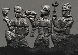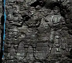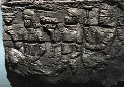 The worshippers are dressed in knee-length tunics and long boots worn over trousers - a clothing style reminiscent of that depicted in the Penjikent murals - and wear shoulder ribbons of the type associated with Hephthalite nobility.[9] The gate is dated to the first half of the 6th century CE (500-550 CE), and the destruction of the palace is attributed to the Islamic conquest of Samarkand in 712 CE. By a happy chance, the partial carbonising of the low-relief carvings has served to help in their preservation, when the aim of those who attempted to burn them was undoubtedly their destruction ( which would been achieved had they been reduced to ash, rather than effectively converted to charcoal).[9][11]