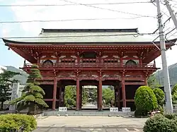 The main gate (山門 Sanmon) to the temple grounds is designed as a two-story rōmon. It is 16.88 m wide, 6.758 m deep and 15 m high, with a roof width of 22.9 m. It is designed in a mixed style of Japanese and Chinese elements. The two guardian figures (仁王Niō ) are distributed to the right and left below. The gate is registered as an important cultural asset of Japan .