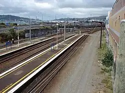 Kaiwharawhara had a unique platform arrangement for New Zealand.[5] Looking north, the left-hand island platform was for up trains, the right-hand platform for down trains. The inner faces were used by Kapiti Line services on the NIMT, the outer faces by Melling Line and Hutt Valley Line services on the Wairarapa Line.