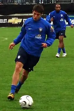 Kaká began his career with São Paulo at the age of eight.[27] He signed a contract at 15 and led the São Paulo youth squad to Copa de Juvenil glory. He made his senior side debut on 1 February 2001 and scored 12 goals in 27 appearances, in addition to leading São Paulo to its first and only Torneio Rio-São Paulo championship, in which he scored two goals in two minutes as a substitute against Botafogo in the final, which São Paulo won 2–1.[30]