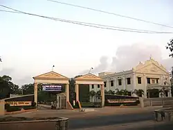 Kakinada was established as a municipality in 1866, reflecting its growing importance.[37] The European Chamber of Commerce, founded in 1868, represented European firms, while the native Chamber of Commerce worked alongside it to promote trade.[38] The local economy thrived on exports of cotton, gingelly oil seeds, sugar, and rice, while imports included iron and copper.[32] The town also became a centre for publications, including the Cocanada Advertiser, a mercantile newspaper, and Suddhiranjani, a Telugu weekly.[32] In 1852, the Pithapuram zamindar established a middle school, which was elevated to a second-grade college in 1884, becoming Pithapur Rajah's College. This institution soon gained prominence as a leading educational centre.[1]