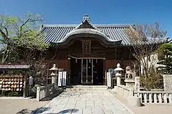 The shrine's principal deity is Kakinomoto no Hitomaro,[1] a god of waka poetry[1] and, by extension, scholarship and literature,[1] but also, by way of a pair of puns on his name, fire safety (火止まる hi-tomaru = "fire stop")[1] and childbirth (人生る hito-umaru = "person is born")[1]