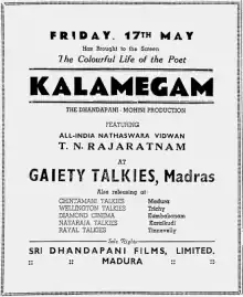 Kalamegam is a 1940 Tamil-language film directed by Ellis R. Dungan and starring nadaswaram player T. N. Rajarathnam Pillai. This was the second film as script writer for the Tamil rationalist poet Bharathidasan. This was the only film in which Pillai acted in his life.[3][4][5][6][7]