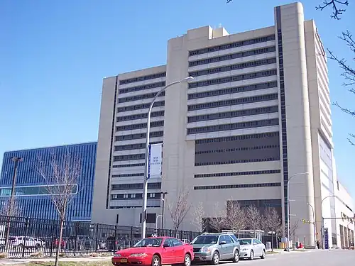 Kaleida Health runs the Buffalo General Medical Center, a hospital on the premises of the Buffalo Niagara Medical Campus. It was founded on its current site in the mid-19th century[4] and has undergone multiple expansions, including one in 1986, that added a 16-story tower to the main complex.[5] The hospital had 24,000 inpatient visits in 2016.[6] The interior lobby was remodeled and the exterior of the building was repainted in 2018, to match the color scheme of newer facilities on the campus, at a cost of $2 million.[6][7]