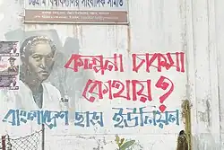 ![]() Wall painting at Chittagong University featuring Kalpana. The Bengali text reads as “Where is Kalpana Chakma?” | |