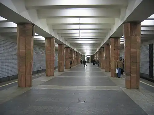 Kaluzhskaya (Russian: Калужская) is a station on the Kaluzhsko-Rizhskaya Line of the Moscow Metro. It is named after the Russian town of Kaluga. Kaluzhskaya opened on 12 August 1974, replacing a temporary station of the same name (located in a service bay of the nearby Kaluzhskoe Depot) that had been operating since 1964. The new station was built to the column tri-span design with tapered octagonal columns in place of the usual square ones. Also the step of the columns was extended from 4 metres to 6.5, and the height of the ceiling raised. The columns are faced with pink Baikal marble, the walls are tiled with white ceramic and decorated with metallic artworks (works of A. Leonteva and M. Shmakova); the floor is laid with grey granite. The architects of the station were N. Demchinskiy and Yuliya Kolesnikova.