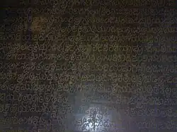 It contains sculptures, including lions and floral motifs. The temple has three cells and hence comes under the classification of Trikutachal temples.[2] There are three shrines here. The first shrine has a statue of Narayana. The second has a statue of Lakshmi Narayana, with the Goddess Lakshmi seated on the lap. The third shrine has a statue of queen Kamala Devi, with her attendants on either sides.[4] The interior roof of the temple has an exquisitely carved gigantic lotus in an inverted form. The temple roof stands on colonnade of pillars with rich carvings. Pillars with roaring lions between them pyramidal towers surrounding these pillars and having girls in poses between them and beautiful scroll work on top. The stone panels along the facade of the temple have emblems of the Kadamba dynasty and other figures.[2]