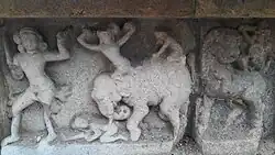 There is a separate shrine for the deity Sarabeswarar,[11] a fusion of man, eagle and lion, who is believed to have relieved the devas (celestial deities) from the fury of Vishnu in the form of Narasimha after he slayed Hiranyakasipu.[5] Sharbeshwaramurti is depicted with six legs, the body and face of a lion, and a tail. It has four human arms, with an axe held in the right upper hand, a noose in the lower right hand, a deer in the upper left hand, and fire in the lower left hand. Narasimha is shown with eight arms, flailing and struggling under Sharbeshwaramurti's feet.[12] The shrine also has sculptures of Sridevi and Bhudevi, the consorts of Vishnu.[5] The bronze image of Sarabheswara temple is believed to be from the period of Kulothunga Chola III.[13]