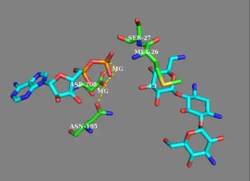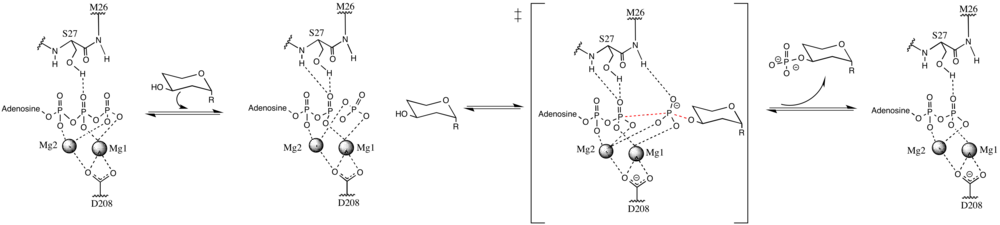 While earlier studies of APH(3') supported a mechanism involving the nucleophilic attack of γ-phosphate by the 3'-hydroxyl, more recent studies suggest that APH(3') catalyzes the transfer of the γ-phosphate from ATP to an aminoglycoside through a dissociative mechanism, where deprotonation of the substrate is not critical to phosphate transfer, but instead the stabilization of a metaphosphate transition state.[8][12] Additionally, APH(3') has a nucleotide positioning loop (NPL) that closes down on the enzyme active site after binding ATP, facilitating the phosphorylation of the 3'-hydroxyl group. Key to correctly positioning the phosphate group are Ser27 and Met26 residues. Initially, two magnesium ions stabilized by Asn195 and Asp208 facilitate the binding of ATP in the active site and orient the ß- and γ-phosphate groups. The NPL then undergoes a conformational change to form a hydrogen bond between Ser27 and the ß-phosphate group. Upon binding of substrate, APH(3') undergoes another conformational change to orient Ser27 such that its amide backbone disrupts the alignment of ß-phosphate and γ-phosphate, weakening the γ-phosphate bond. The amide backbone of Met26 forms a hydrogen bond with the metaphosphate to stabilize the transition state, as a magnesium ion (designated Mg1) then lengthens the γ-phosphate bond, breaking it and effectively phosphorylating the hydroxyl group.[8]