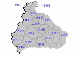 Kangwon Province (Kangwŏndo; Korean pronunciation: [kaŋ.wʌn.do]) is a province of North Korea, with its capital at Wŏnsan. Before the division of Korea in 1945, Kangwŏn Province and its South Korean neighbour Gangwon Province (also spelled Kangwon Province sometimes) formed a single province that excluded Wŏnsan.